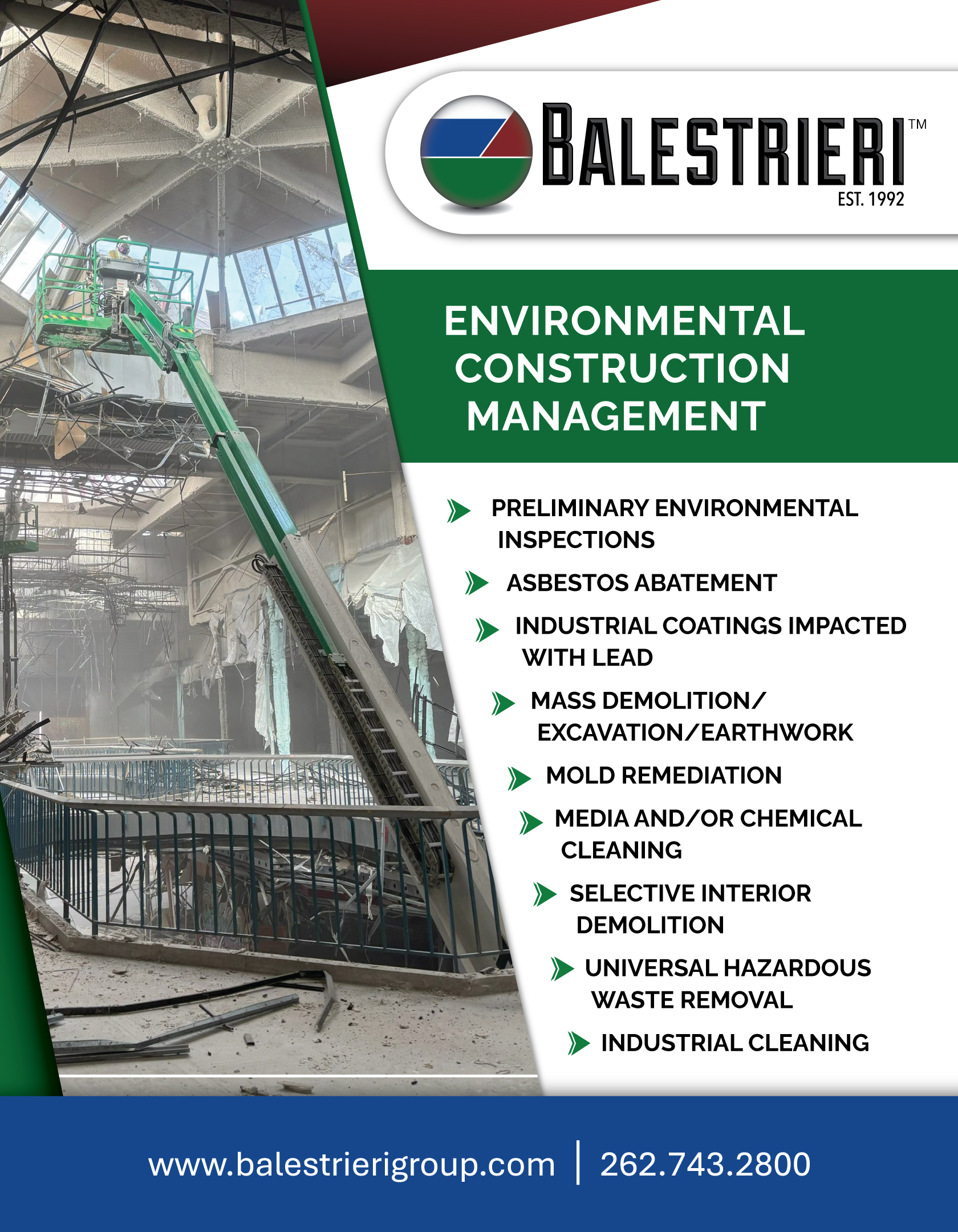 Established in 1992, Balestrieri Environmental & Development, Inc. is a multi-disciplined Environmental Construction Management firm specializing in turn-key renovation and demolition projects. Our professionally provided services include preconstruction inspections, asbestos abatement, industrial coatings impacted with lead, mold remediation, media and/or chemical cleaning, selective interior demolition, earthwork, demolition, excavation, universal hazardous waste removal, duct cleaning, dust particulate containment, mechanical re-insulation, aerial imagery, and training.